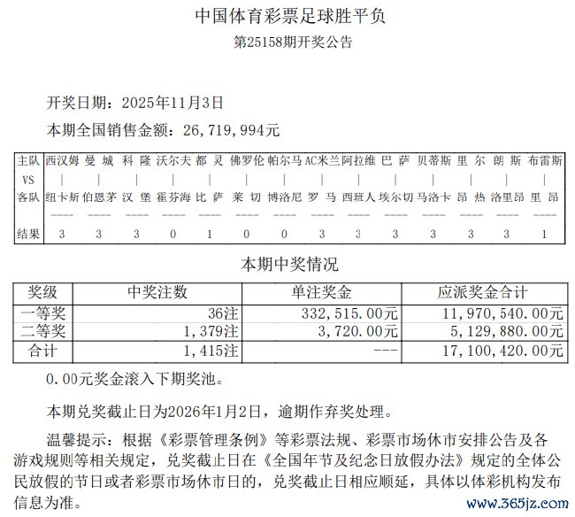 - 2025-12-15西汉姆3-1纽卡1赔5 足彩头奖开36注33.2万元